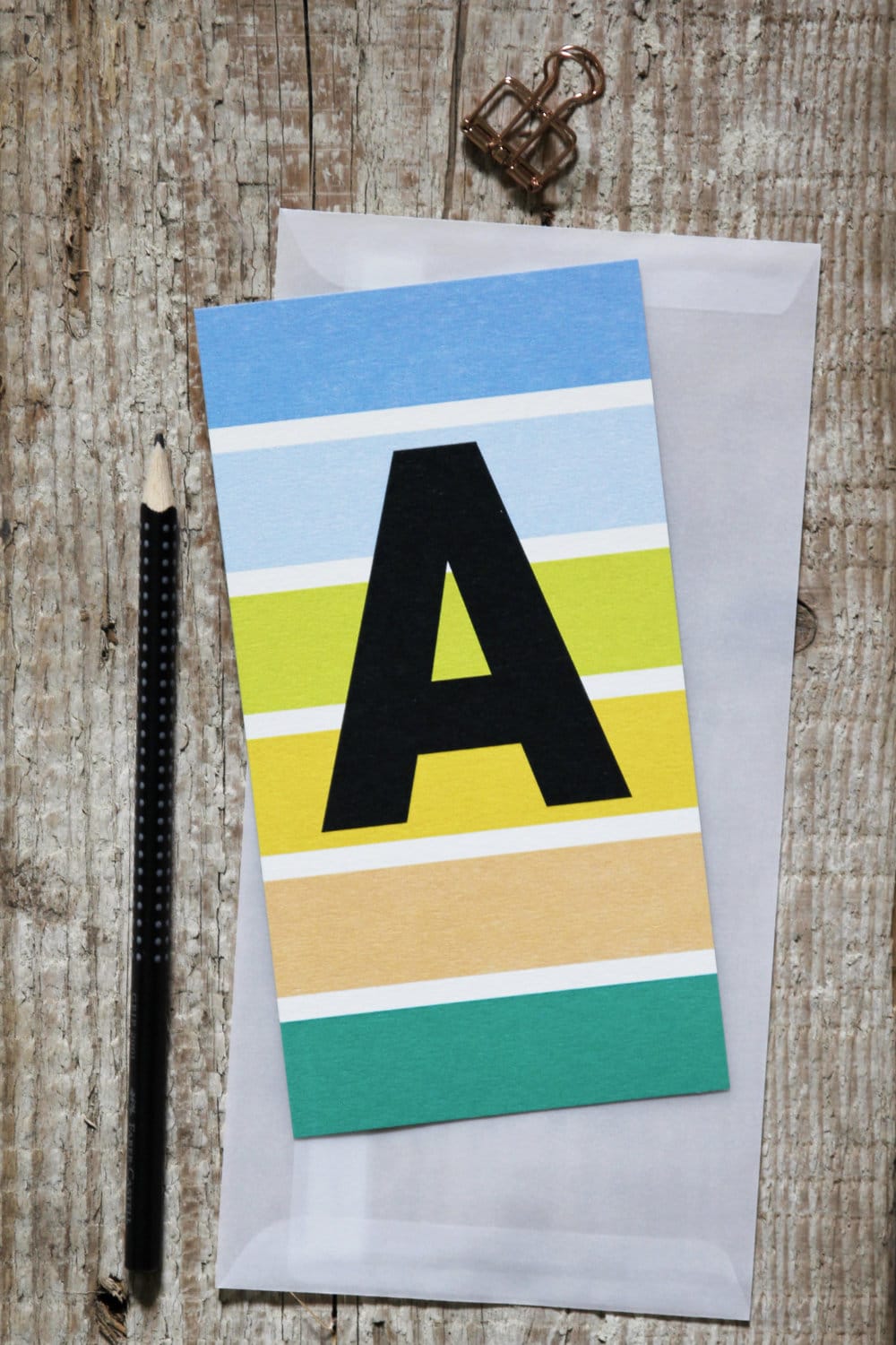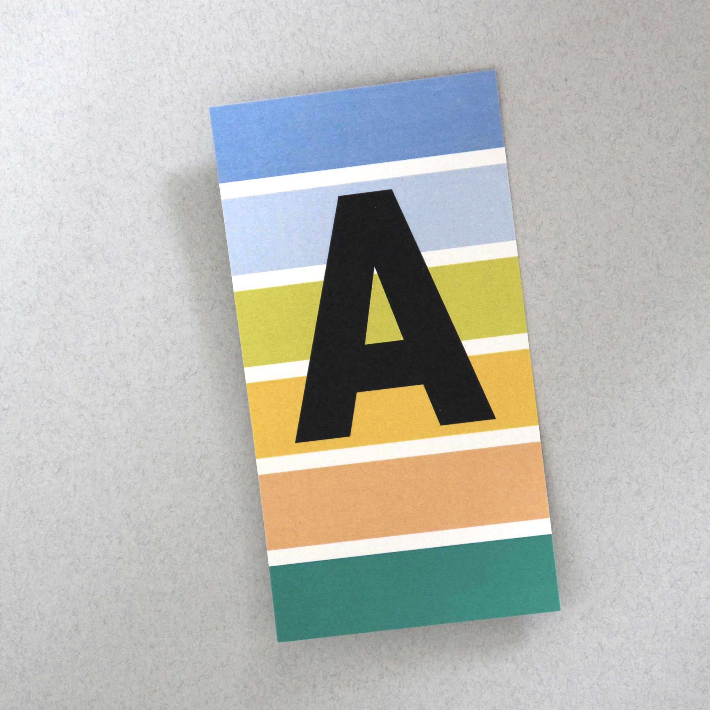 Bunt gestreifte ABC-Postkarte – Buchstabe „A“.