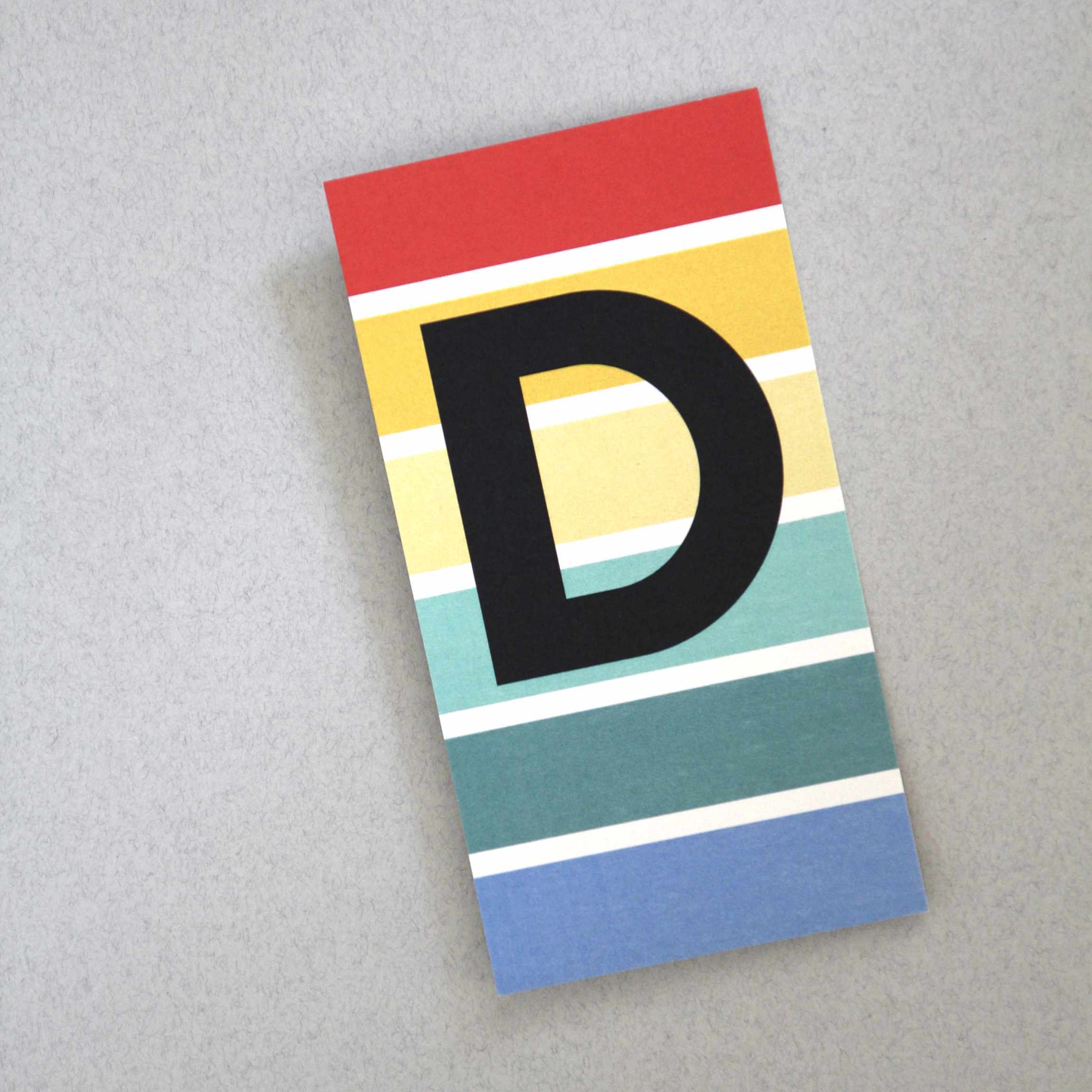 Bunt gestreifte ABC-Postkarte – Buchstabe „D“.