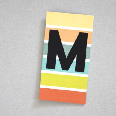 Bunt gestreifte ABC-Postkarte – Buchstabe „M“.