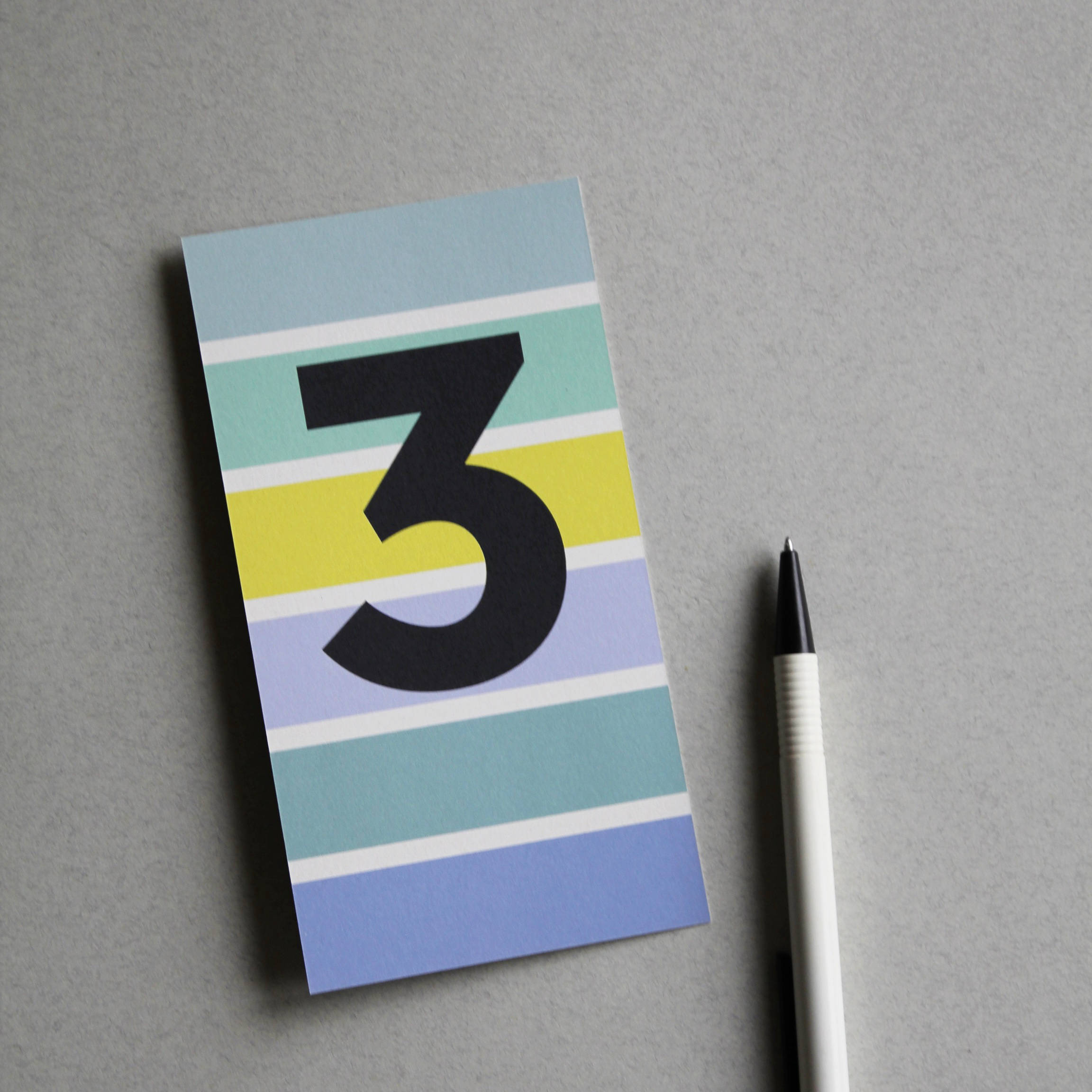 Fröhlich-bunt-gestreifte Ziffern-Postkarte – perfekt als Dekoration oder auch für die Schule oder den Kindergarten geeignet.
